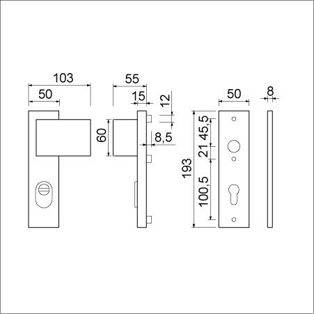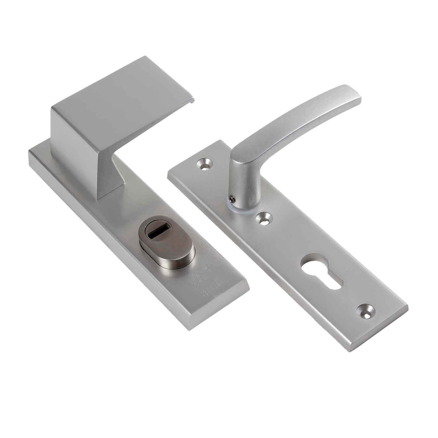 Buitenschild 15 mm met deurduwer 90/60, binnenschild 8 mm met nylon ring,gelagerde wisselstift, gatdeelkruk 332 m6 , quickpuntschroef en 3 schroeven M6 RVS.