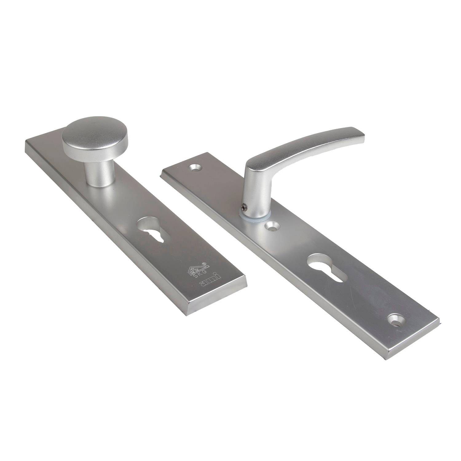 Complete set: Buitenschild 12 mm met knop 169/50 vast, binnenschild 8 mm met nylon ring,gelagerde wisselstift, gatdeelkruk 332 M6,quickpuntschroef en 3 schroeven M6 RVS