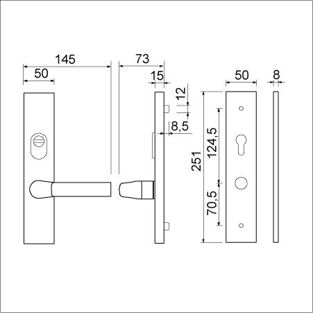 binnenschild 8 mm met deurkruk 379 ROTA verend vastdraaibaar, vierkantstift 8 mm en 2 schroeven M6 RVS