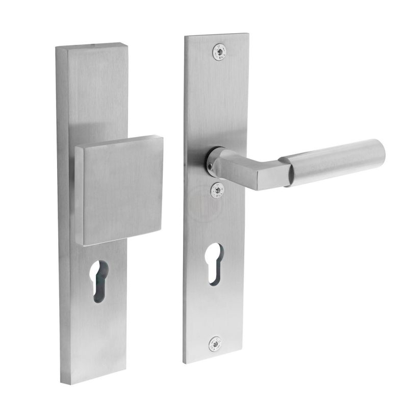 Rechthoekig voordeurbeslag met vaste vierkante greep en een bijpassende kruk in mat verchroomde uitvoering met SKG*** keurmerk. Dit product is uitgevoerd in chroom en wordt naderhand geborsteld waardoor de set een matte uitstraling krijgt. Het veiligheidsbeslag is SKG*** gekeurd, wat betekent dat het om extra zwaar inbraakwerend beslag gaat.