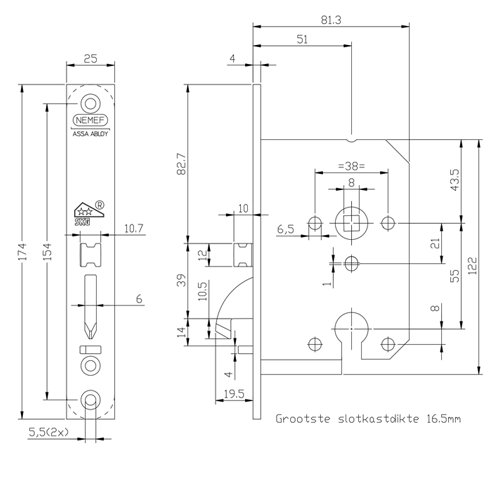 | Afmetingen voorplaat (in mm): | 174 x 25 |