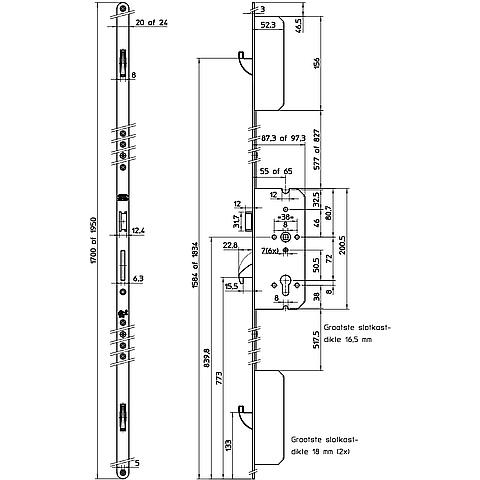 - Door speciale haakschootlengte kan een sluitnaad (stolpdeuren) van 10 mm overbrugd worden