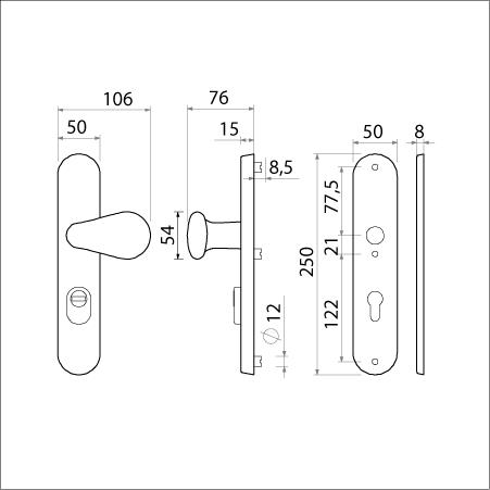 binnenschild 8 mm met deurkruk 386 ROTA verend vastdraaibaar, vierkantstift 8 mm en 3 schroeven M6 RVS