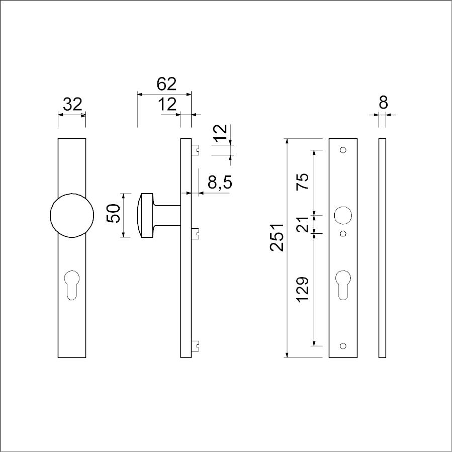 binnenschild 8 mm met deurkruk 379 ROTA verend vastdraaibaar, vierkantstift 8 mm en 3 schroeven M6 RVS