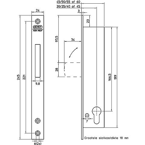 Nemef zwenkschoot smaldeurslot 9662/07 met een smalle doornmaat wordt doorgaans toegepast in metalen en kunststof binnen- en buitendeuren. De stijlen van de deuren zijn smaller waardoor de doornmaat ook kleiner is. Dit geldt ook voor metalen kokers of kunststof en aluminium puien waar het gebied smaller is. Dit slot is verkrijgbaar in verschillende doornmaten te weten: 30-35 en 40mm. Zowel links als rechts bruikbaar. Staal verzinkte zwenkschoot met beveiligingspennen.
