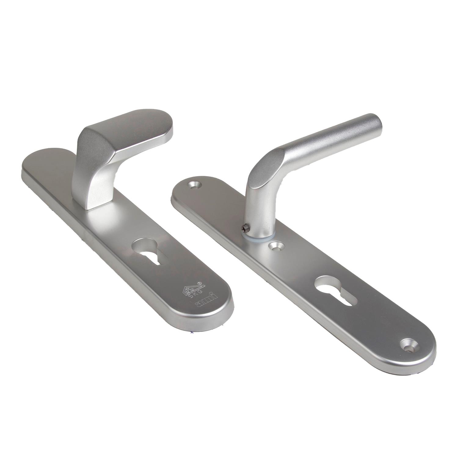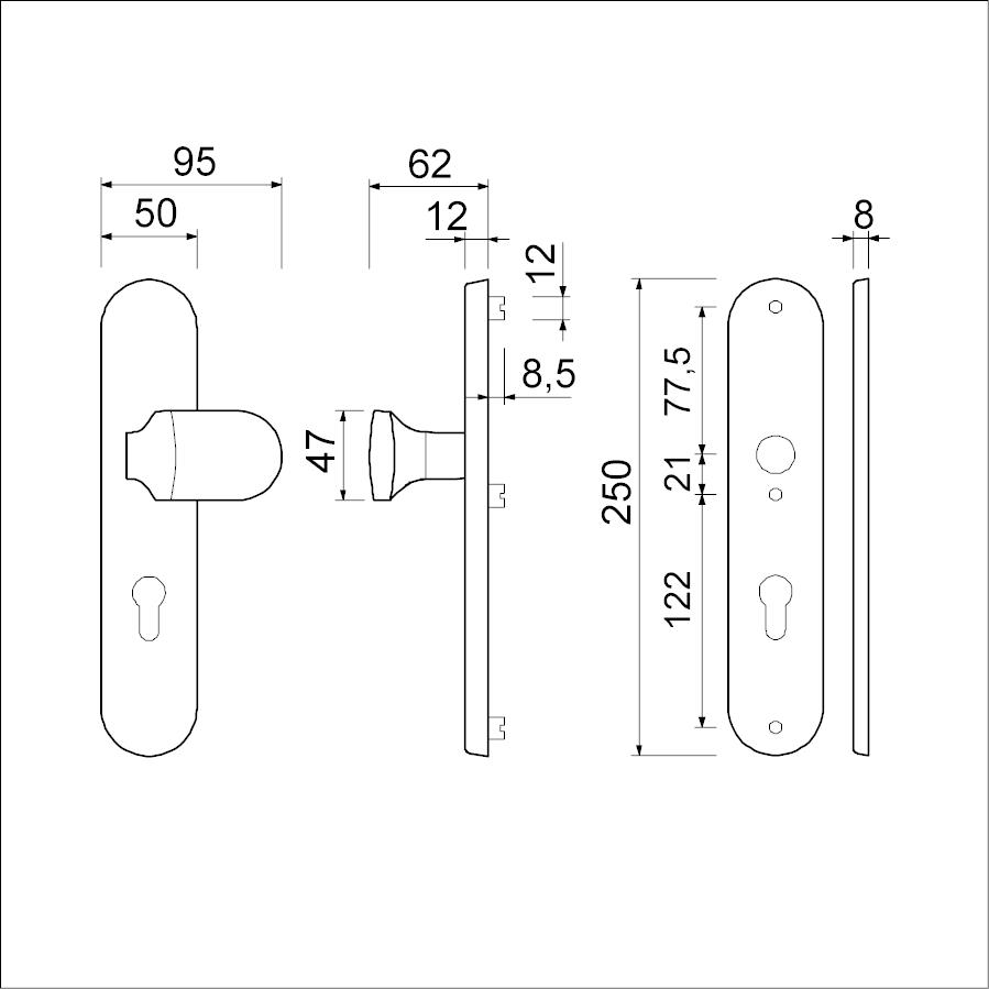 Complete set: Buitenschild 12 mm met knop 145 VARO, binnenschild 8 mm met nylon ring,gelagerde wisselstift, gatdeelkruk 369 M6,quickpuntschroef en 3 schroeven M6 RVS